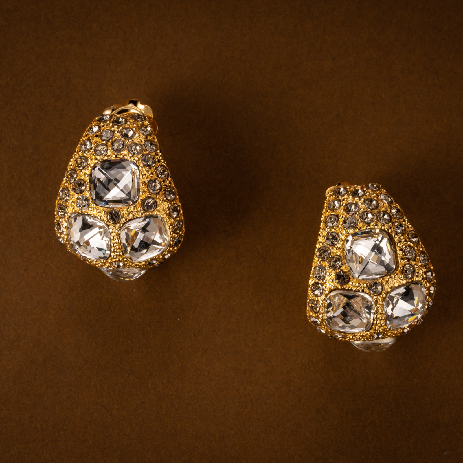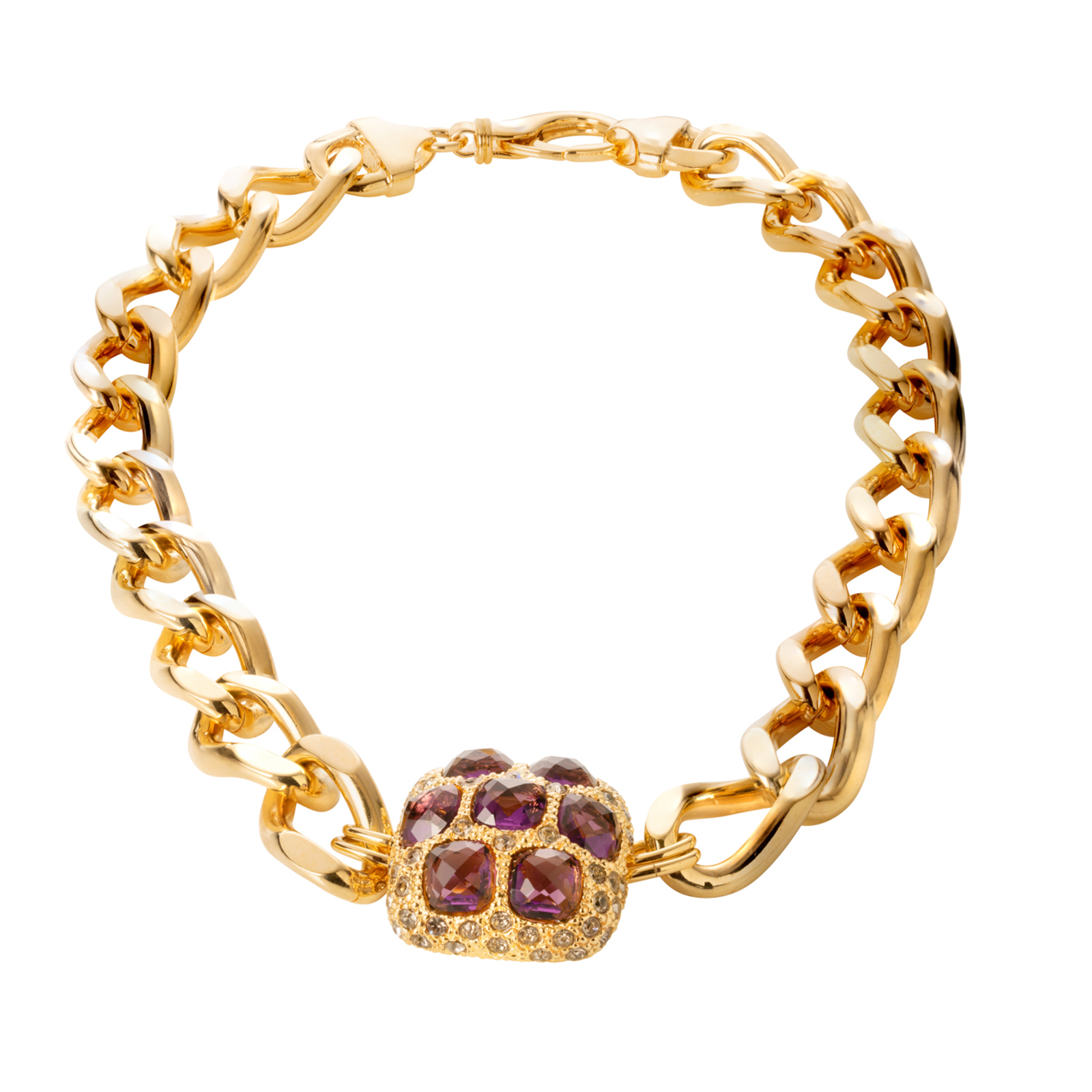 Bracciale in bronzo rigido con molla e chiusura magnetica, arricchito con pavé di cristalli a forma carré di colore crystal e piccole pietre di forma tonda color black diamond, placcato in oro 18 kt